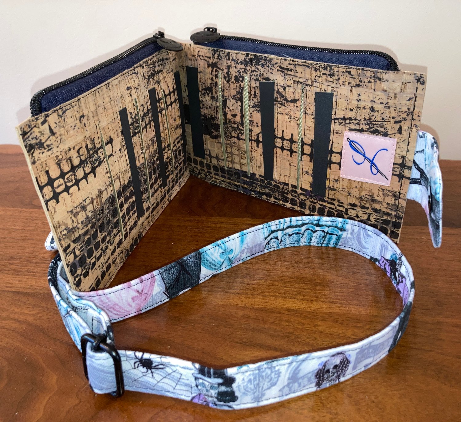A PDF SEWING PATTERN for the Mocha © Wallet. The Mocha Wallet is suited for raw edge materials and has two sections, each having a zipper pouch large enough for bills, receipts, a passport, or a cell phone, with a magnetic snap closure tab holding the two pouches together. There are 6 card slots on each pouch, making 12 card slots total. The Mocha also comes with choices of a wrist strap, an adjustable shoulder strap or our signature “Hardware Heavy” adjustable shoulder strap, with instructions for using various accent materials. Your Mocha Wallet will have a finished size of approximately 9" long x 5" wide (22.8 cm x 12.7 cm); twice as long when open to accommodate the 12 card slots, 6 each side!