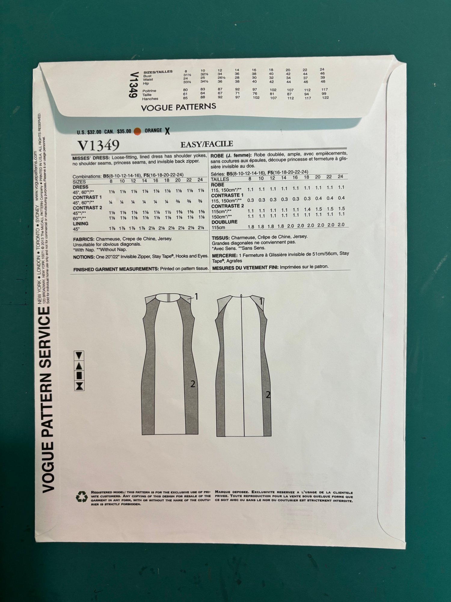 Vogue Patterns 2013, uncut, factory folds, out of print, original sewing pattern with all the tissue pattern pieces and instructions. Not a PDF or copy, not a finished garment. SHIPPING ONLY WITHIN CANADA for now.